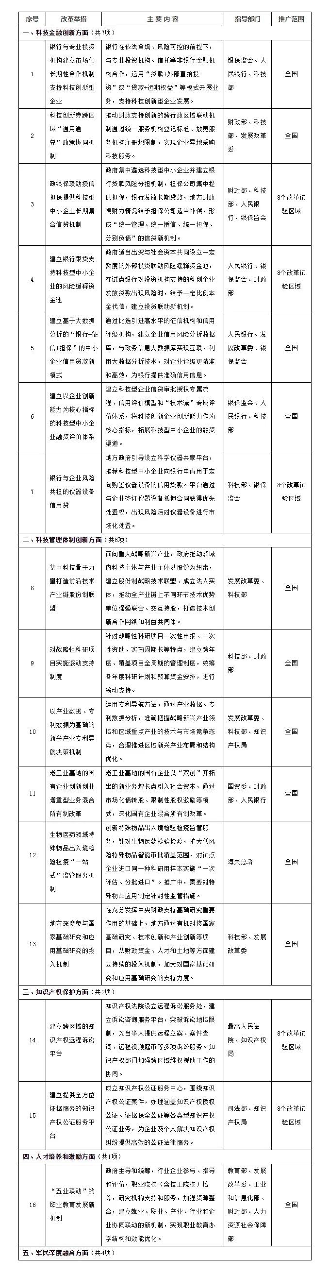 本次正式發(fā)布的20項改革舉措,是繼2017年首批13項、2018年第二批23項之后,由國辦發(fā)布的第3批向全國或在8個試驗區(qū)域范圍內(nèi)復(fù)制推廣、支持創(chuàng)新的改革舉措,涵蓋了科技金融創(chuàng)新、科技管理體制創(chuàng)新、知識產(chǎn)權(quán)保護(hù)、人才培養(yǎng)和激勵和軍民深度融合5個重點(diǎn)領(lǐng)域。根據(jù)我們觀察分析,經(jīng)過了前期的沉淀,以及進(jìn)一步的實(shí)踐探索,改革進(jìn)一步走向“深處”和“實(shí)處”,這批舉措緊密呼應(yīng)當(dāng)前中央的重要改革關(guān)切,充分體現(xiàn)了“實(shí)”和“新”,在一些改革的“老大難”問題上進(jìn)一步破題。