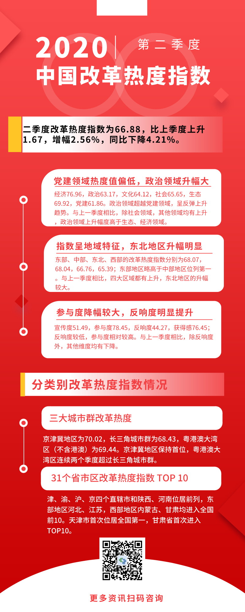 疫情防控情勢轉(zhuǎn)好和主要經(jīng)濟(jì)指標(biāo)呈恢復(fù)性增長,是二季度改革熱度指數(shù)提升的背景原因。另外,“兩會”激活大量公共議題尤其是政治領(lǐng)域的改革話題,以及期間中央出臺的多項扶持中小微企業(yè)、促進(jìn)高校畢業(yè)生就業(yè)、加快要素市場化改革、完善社會主義市場體制等政策,對二季度改革熱度指數(shù)的回升亦有明顯的貢獻(xiàn)。
