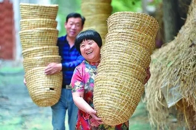 山東臨沂市郯城縣馬頭鎮(zhèn)草編合作社社員在搬運用秸稈編制的工藝品