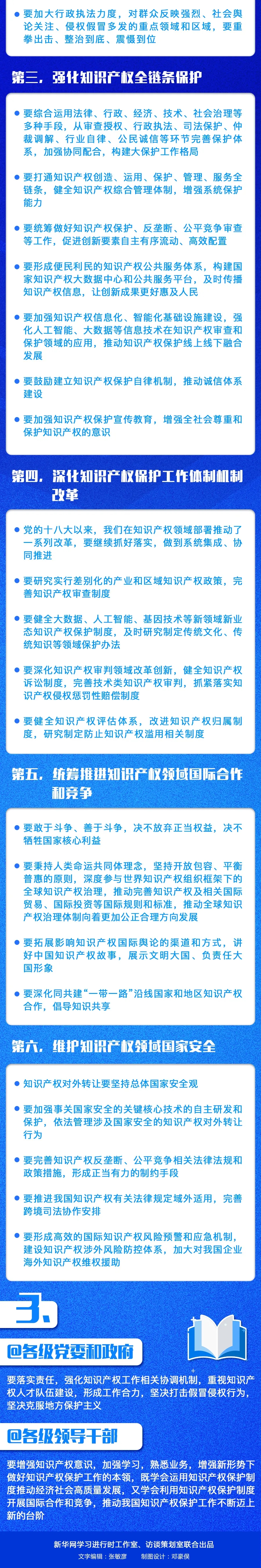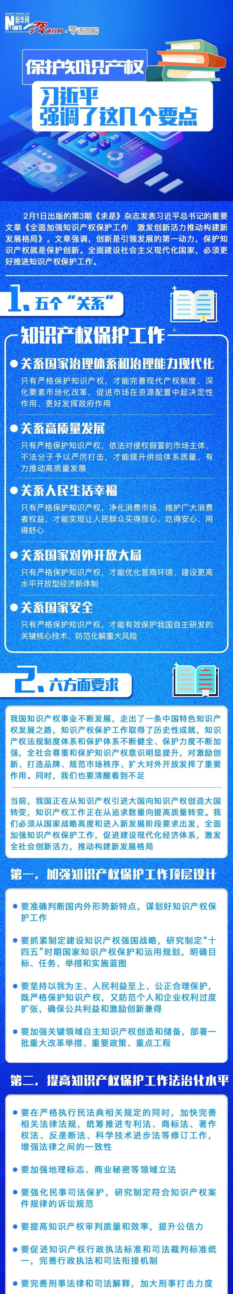 編者按:當(dāng)前,我國正在從知識產(chǎn)權(quán)引進(jìn)大國向知識產(chǎn)權(quán)創(chuàng)造大國轉(zhuǎn)變,知識產(chǎn)權(quán)工作正在從追求數(shù)量向提高質(zhì)量轉(zhuǎn)變。進(jìn)入新發(fā)展階段,如何全面加強(qiáng)知識產(chǎn)權(quán)保護(hù)工作?第3期《求是》雜志發(fā)表習(xí)近平總書記重要文章《全面加強(qiáng)知識產(chǎn)權(quán)保護(hù)工作 激發(fā)創(chuàng)新活力推動構(gòu)建新發(fā)展格局》。文章從國家戰(zhàn)略高度和進(jìn)入新發(fā)展階段要求出發(fā),對全面加強(qiáng)知識產(chǎn)權(quán)保護(hù)工作提出六點(diǎn)要求,一起來看。