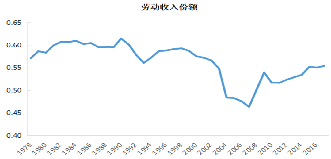 一是提高勞動(dòng)報(bào)酬占比。我國(guó)在經(jīng)濟(jì)高速發(fā)展過(guò)程中,勞動(dòng)所得占比曾出現(xiàn)一定程度的下降,2008年之后有所回升,但仍然偏低。