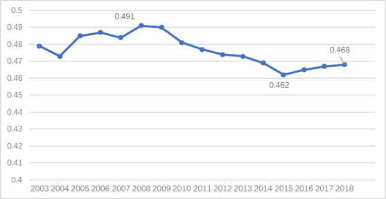 圖1:2003-2018年全國(guó)居民收入基尼系數(shù)
