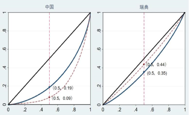 資料來(lái)源:中國(guó)的曲線根據(jù)CHIPS2018年調(diào)查數(shù)據(jù)計(jì)算繪制。瑞典的曲線根據(jù)Nieuwenhuis,Nelson和Alm在2020年發(fā)表論文中2003年的基尼系數(shù)與集中度的數(shù)據(jù)模擬繪制。