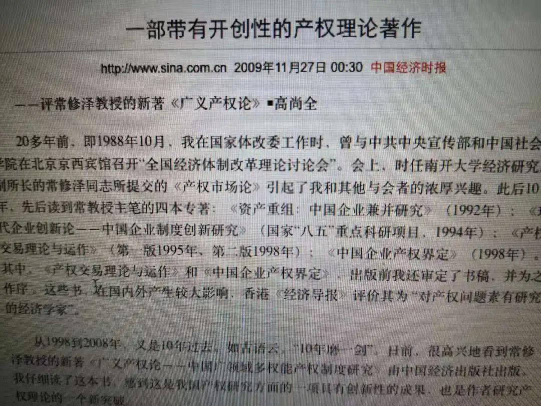 出版后,有肯定,也有非議:如說天地人產(chǎn)權(quán)是“異想天開”,產(chǎn)權(quán)三要義(廣領(lǐng)域、多權(quán)能、四聯(lián)動)“過于寬泛”等等(這很正常的)。在此之際,您也參與討論,公開發(fā)表文章,支持“從世界和中國大局研究產(chǎn)權(quán)問題”;肯定“廣義產(chǎn)權(quán)理論”,認(rèn)為“對國家發(fā)展有應(yīng)用價值”等(見高尚全:《一部帶有開創(chuàng)性的產(chǎn)權(quán)理論著作》,《中國經(jīng)濟(jì)時報》2010年11月27日)。今天,再憶這段往事,再讀您的文章,既感謝您2003年的指點,也感激您2010年的支持。