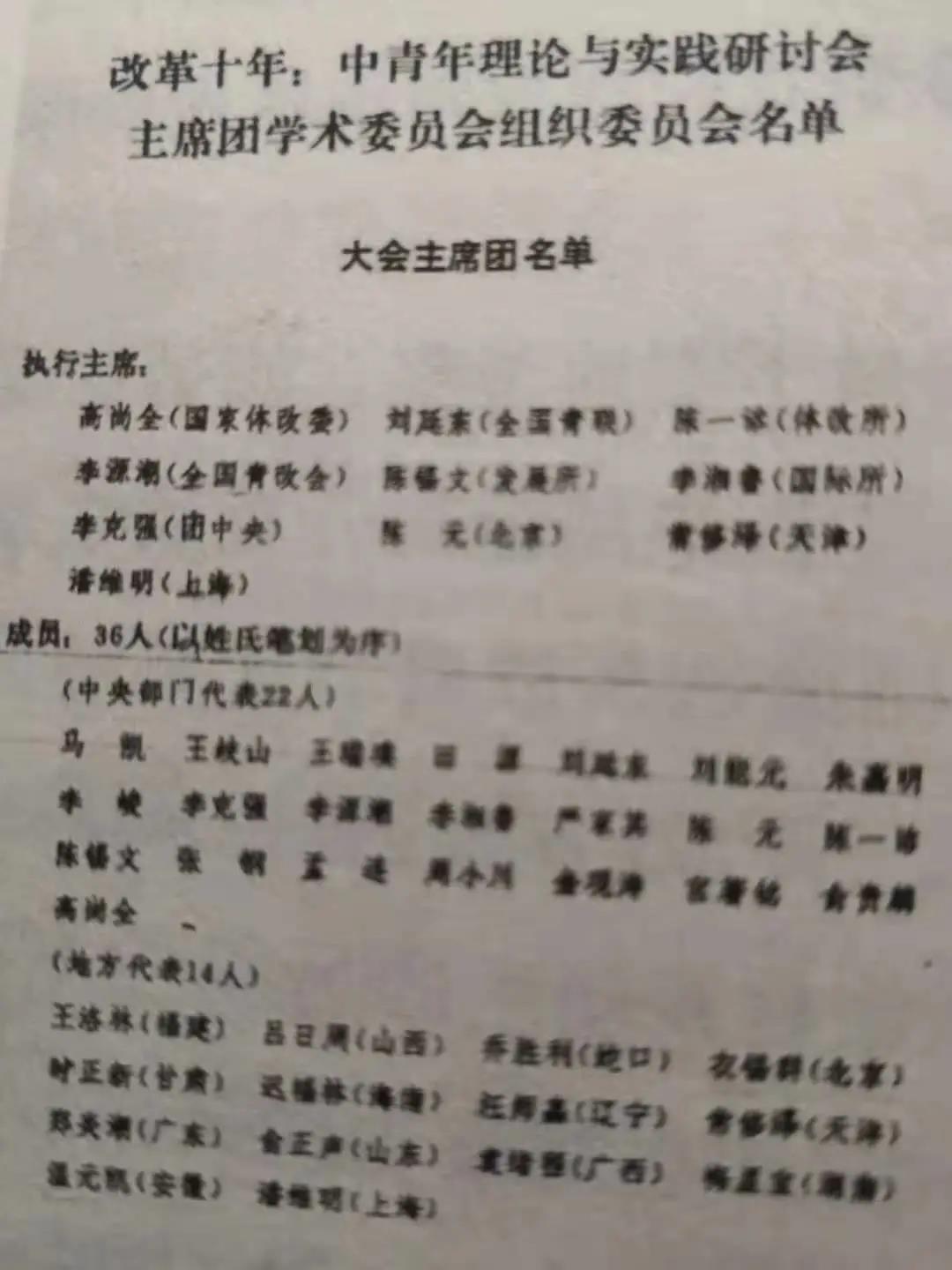 更使我難以忘懷的是,1989年春天的 “改革十年”大會(全稱為“改革十年:中青年理論與實踐研論會”),在北京京豐賓館舉行。近日,微信群流傳當(dāng)年大會主席團(tuán)名單,您位列十名執(zhí)行主席之首(我作為天津代表忝列其中)。在這個有全國400多位代表參加的大會上,各種思潮涌現(xiàn):穩(wěn)健改革、偏于保守和偏于激進(jìn)三種意見激烈爭辯。我參加了幾次執(zhí)行主席會議。在您和李克強(qiáng)、李源潮、劉延?xùn)|等執(zhí)行主席的共同主持下,會議順利進(jìn)行并圓滿結(jié)束。閉幕前,受到中央政治局、國務(wù)院領(lǐng)導(dǎo)和中央顧問委員會老同志的接見。在改革十年這一關(guān)鍵節(jié)點上的會議,受到各方關(guān)注和重視,是很不容易的。對這樣一個重要會議且直接共事數(shù)日,我又怎么能忘記?
