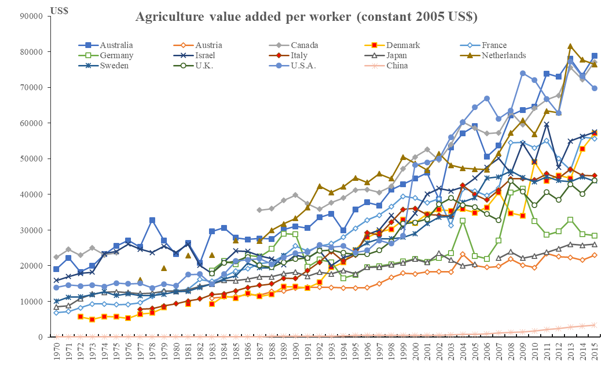 如圖5,西方城市化過程中兩個收入差距的縮小在中國沒有出現(xiàn)。中國在最快速城市化階段出現(xiàn)了城鄉(xiāng)收入差距拉大,第一是我們只有快速城市化,但沒有城鄉(xiāng)融合。第二是我們城市化的模式是回村的城市化模式。在城市里干工作,干到一定程度再回到農(nóng)村,這是全世界沒有的。第三是農(nóng)業(yè)競爭力下降?,F(xiàn)在一定要有一個認(rèn)識,農(nóng)業(yè)的份額降到10%以后,各個國家的農(nóng)業(yè)到底在干什么?我們現(xiàn)在想到農(nóng)業(yè)到10%,再到2%、1%,農(nóng)業(yè)就可有可無了,這種觀點是錯誤的。所有國家的農(nóng)業(yè)在降到10%以后,農(nóng)業(yè)在變強,它的農(nóng)業(yè)和原來的農(nóng)業(yè)完全不一樣。中國由于單向城市化的模式,最后農(nóng)業(yè)競爭力進一步下降。(如圖6)我們現(xiàn)在只有6%、7%的農(nóng)業(yè),這個農(nóng)業(yè)的競爭力是下降的,背后是農(nóng)業(yè)成本上升,所有成本都在上升。