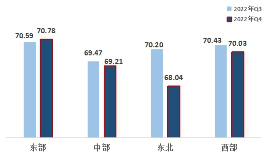2、西部地區(qū)超越中部、東北地區(qū)。東部、西部、中部、東北地區(qū)指數(shù)分別為70.78、70.03、69.21、68.04。東部地區(qū)領(lǐng)先,西部地區(qū)超越中部地區(qū)排名第二,東北地區(qū)最后。自2022年第一季度以來(lái),西部地區(qū)連續(xù)三個(gè)季度超越中部地區(qū)。與上一季度相比,東部地區(qū)有所增長(zhǎng),中部、東北、西部地區(qū)下滑,東北地區(qū)指數(shù)降幅較大。