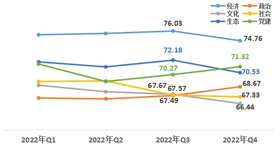 1、政治、黨建領(lǐng)域上升。從六大領(lǐng)域來(lái)看,經(jīng)濟(jì)領(lǐng)域74.76,政治領(lǐng)域68.67,文化領(lǐng)域66.44,社會(huì)領(lǐng)域67.33,生態(tài)領(lǐng)域70.53,黨建領(lǐng)域71.32。與上一季度相比,政治、黨建領(lǐng)域均有上升,經(jīng)濟(jì)、文化、社會(huì)、生態(tài)領(lǐng)域略有下降。