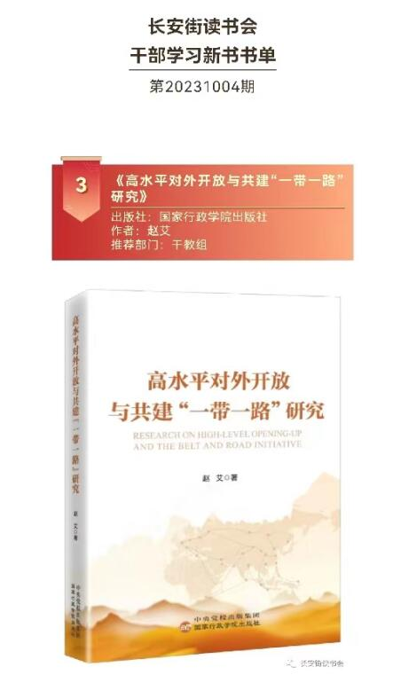 2023年10月18日,在第三屆“一帶一路”國際合作高峰論壇在北京隆重舉辦之際,長安街讀書會發(fā)布第20231004期干部學(xué)習(xí)新書書單,我會常務(wù)副會長兼秘書長趙艾新著《高水平對外開放與共建“一帶一路”研究》名列推薦榜單。