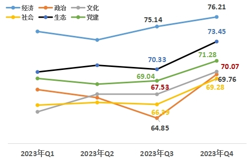 從改革熱度指數(shù)的六大領(lǐng)域來(lái)看,經(jīng)濟(jì)領(lǐng)域76.21,政治領(lǐng)域69.76,文化領(lǐng)域70.07,社會(huì)領(lǐng)域69.28,生態(tài)領(lǐng)域73.45,黨建領(lǐng)域71.28。與上一季度相比,六大領(lǐng)域均有上升,政治領(lǐng)域升幅最高,經(jīng)濟(jì)領(lǐng)域升幅最低。