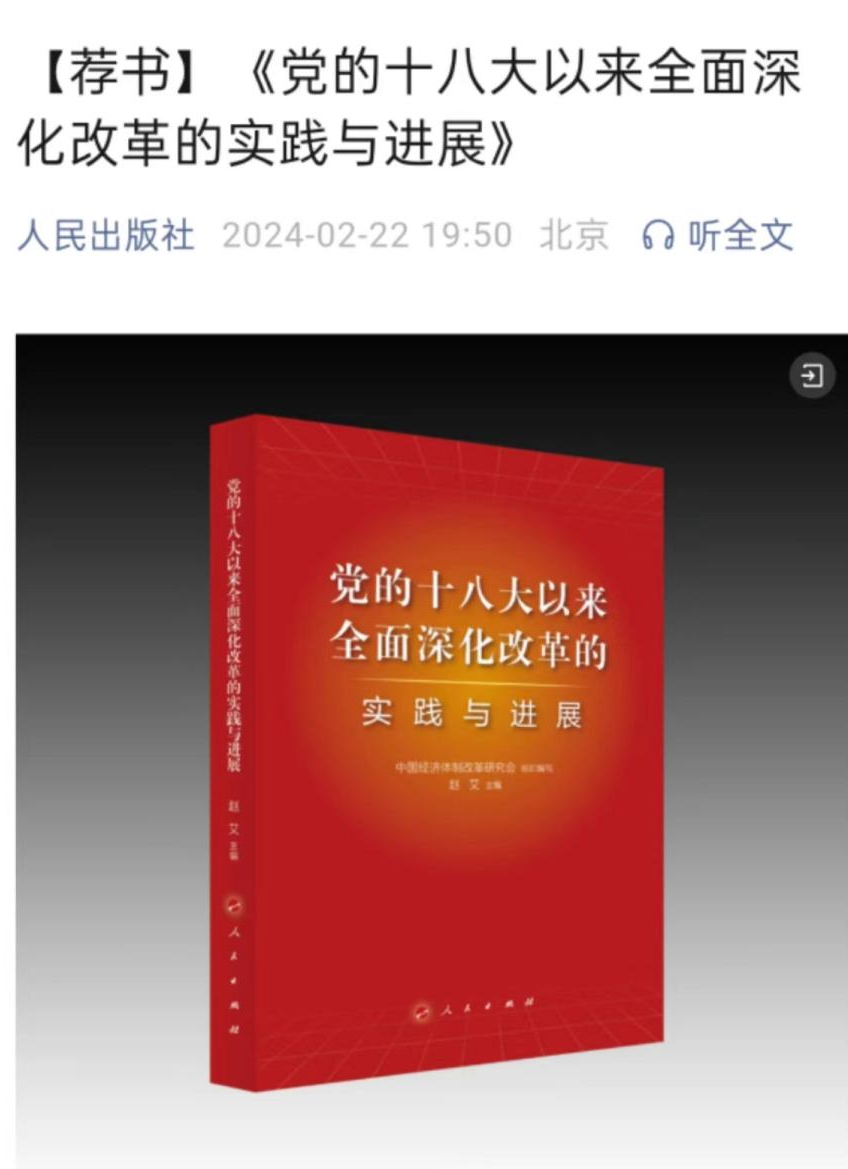 2024年2月22日,由我會組織編寫,會長彭森作序、常務副會長兼秘書長趙艾主編的《黨的十八大以來全面深化改革的實踐與進展》一書,入選人民出版社官方微信公眾號[薦書]欄目,成為人民出版社推薦的新書。