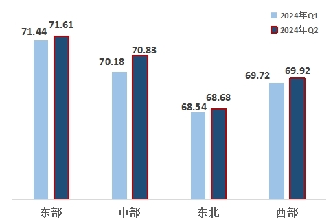 從四大區(qū)域來(lái)看,東部、中部、東北、西部地區(qū)指數(shù)分別為71.61、70.83、68.68、69.92。四大區(qū)域排名與上一季度保持一致,分別為東部第一,中部第二,西部第三,東北第四。與上一季度相比,四大區(qū)域改革熱度指數(shù)均有小幅提升,中部地區(qū)增幅最大。