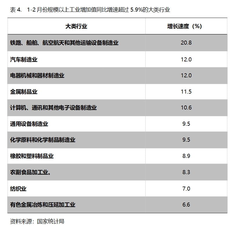 1-2月份,增長速度超過規(guī)模以上工業(yè)增長5.9%的主要大類行業(yè)共有11個,即鐵路、船舶、航空航天和其他運輸設(shè)備制造業(yè)增長20.8%,汽車制造業(yè)增長12.0%,電器機械和器材制造業(yè)增長12.0%,金屬制品業(yè)增長11.5%,計算機、通訊和其他電子設(shè)備制造業(yè)增長10.6%,通用設(shè)備制造業(yè)增長9.5%,化學原料和化學制品制造業(yè)增長9.5%,橡膠和塑料制品業(yè)增長8.9%,農(nóng)副食品加工業(yè)增長8.3%,紡織業(yè)增長7.0%,有色金屬冶煉和壓延加工業(yè)增長6.6%。