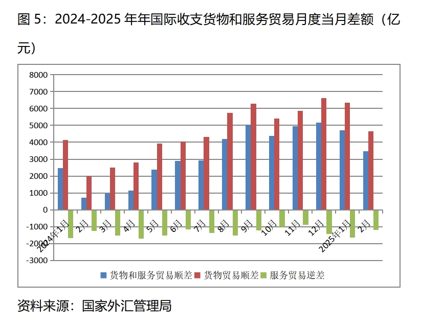 (四)國(guó)際收支貨物和服務(wù)貿(mào)易順差增加。今年1月份國(guó)際收支貨物和服務(wù)貿(mào)易順差4711億元,比上年同月的2459億元增加2252億元;2月份順差3459億元,比上年同月的724億元增加2735億元,國(guó)際收支貨物和服務(wù)貿(mào)易繼續(xù)保持多年以來(lái)順差的態(tài)勢(shì),同時(shí)今年以來(lái)的順差比上年同期增加較多。國(guó)際收支貨物和服務(wù)順差中,貨物貿(mào)易繼續(xù)保持順差,服務(wù)貿(mào)易仍然保持逆差。1月份國(guó)際收支貨物貿(mào)易順差6342億元,服務(wù)貿(mào)易逆差1631億元;2月份國(guó)際收支貨物貿(mào)易順差4638億元,服務(wù)貿(mào)易逆差1178億元。在國(guó)際環(huán)境趨于更加復(fù)雜嚴(yán)峻形勢(shì)下,國(guó)際收支貨物和服務(wù)貿(mào)易仍實(shí)現(xiàn)較大順差,充分說(shuō)明我國(guó)經(jīng)濟(jì)有著較強(qiáng)的韌性和回旋空間。