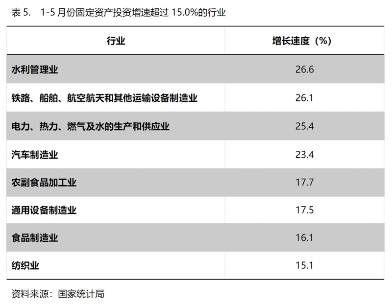 1-5月份,固定資產(chǎn)投資增速超過15%的主要行業(yè)共8個,即水利管理業(yè)增長26.6%,鐵路、船舶、航空航天和其他運(yùn)輸設(shè)備制造業(yè)增長26.1%,電力、熱力、燃?xì)饧八纳a(chǎn)和供應(yīng)業(yè)增長25.4%,汽車制造業(yè)增長23.4%,農(nóng)副食品加工業(yè)增長17.7%,通用設(shè)備制造業(yè)增長17.5%,食品制造業(yè)增長16.1%,紡織業(yè)增長15.1%。