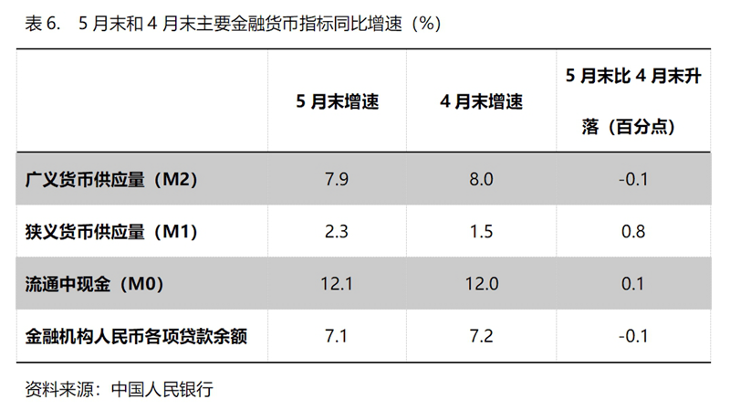 (六)M2增速由升轉(zhuǎn)落。5月末,廣義貨幣供應(yīng)量(M2)同比增長7.9%,比4月末增長8.0%回落0.1個百分點,基本保持了上月末的增速;狹義貨幣供應(yīng)量(M1)增速比上月有所回升,5月末同比增長2.3%,比4月末增長1.5%回升0.8個百分點,而4月末增幅比3月末增幅回落0.1個百分點;流通中貨幣(M0)增速持續(xù)回升,5月末同比增長12.1%,比4月末增長12.0%回升0.1個百分點,而4月末增速比3月末增速回升0.5個百分點。5月末M2增速與上月增速基本持平,M1和M0增速回升,表明貨幣政策仍在向適度寬松方向的要求運(yùn)行,但需要關(guān)注的還是M1增速仍還比較緩慢。