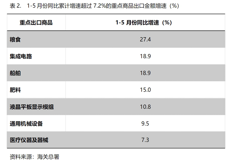 1-5月份,出口金額同比增速超過7.2%的重點商品共有7類,即糧食增長27.4%,集成電路增長18.9%,船舶增長18.9%,肥料出口增長15.0%,液晶平板顯示模組增長10.8%,通用機(jī)器設(shè)備增長9.5%,醫(yī)療儀器及器械增長7.3%。