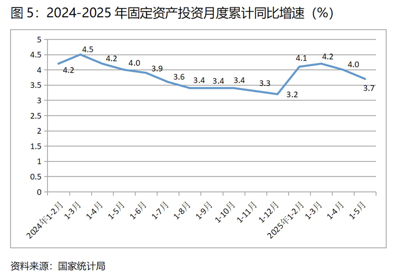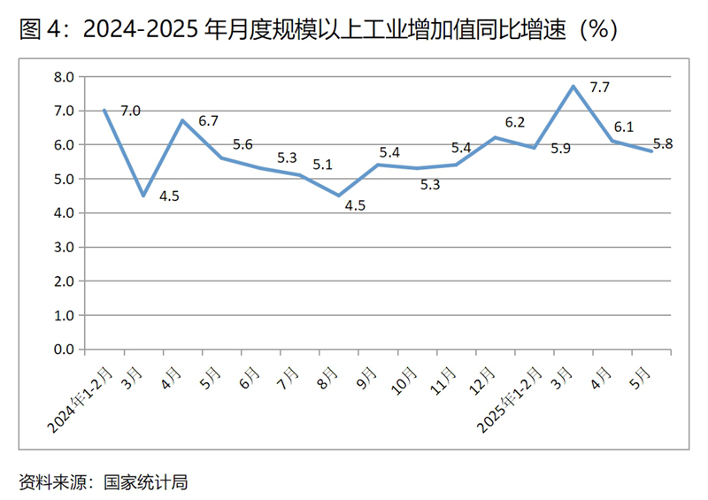 (四)工業(yè)增速持續(xù)回落。5月份,規(guī)模以上工業(yè)增加值同比增長5.8%,比上月增長6.1%回落了0.3個百分點,4月份比3月份回落了1.6個百分點,呈現(xiàn)出兩個月的連續(xù)回落。從工業(yè)三大門類看,主要是制造業(yè)增速回落。5月份采礦業(yè)同比增長5.7%,與上月持平;制造業(yè)增長6.2%,比上月回落0.4個百分點;電力、熱力、燃?xì)饧八a(chǎn)和供應(yīng)業(yè)增長2.2%,比上月回升0.1個百分點。5月份工業(yè)增速回落幅度雖然比上月收窄不少,但還是要密切關(guān)注回落背后反映出的工業(yè)增長動力未來可能變動的趨勢。