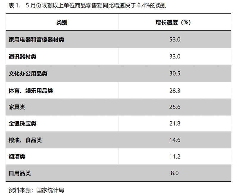 5月份,限額以上單位商品零售額增速快于社會消費(fèi)品零售總額6.4%增速的共有9類,即家用電器和音像器材類增長53.0%,通訊器材類增長33.0%,文化辦公用品類增長30.5%,體育、娛樂用品類增長28.3%,家具類增長25.6%,金銀珠寶類增長21.8%,糧油、食品類增長14.6%,煙酒類增長11.2%,日用品類增長8.0%。
