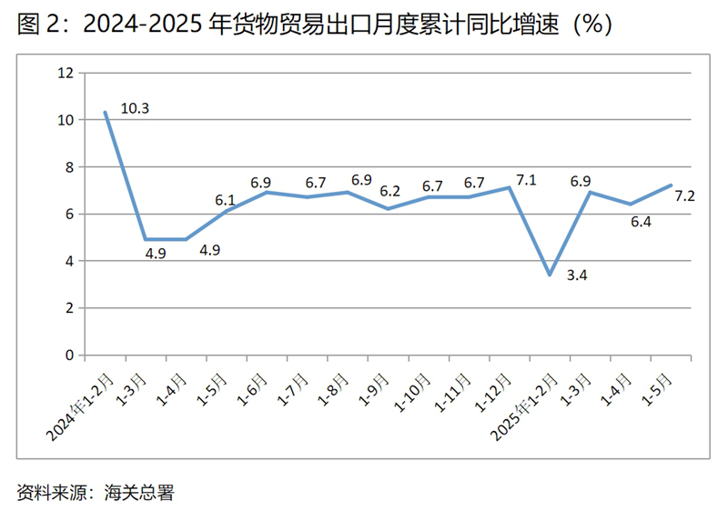 (二)貨物出口增速由落轉(zhuǎn)升。1-5月份,貨物出口同比增長7.2%,比1-4月份增長6.4%回升0.8個百分點,1-4月份比1-3月份回落0.5個百分點,增速呈現(xiàn)出由落轉(zhuǎn)升的態(tài)勢。貨物出口對主要貿(mào)易出口經(jīng)濟(jì)體增速有升有落,1-5月份對歐盟出口同比增長7.7%,比1-4月份4.9%增速回升2.8個百分點;對美國出口下降8.7%,比1-4月份下降2.5%擴(kuò)大6.2個百分點;對東盟出口增長13.5%,比1-4月份11.5%增速回升2.0個百分點;對拉丁美洲出口增長10.6%,比1-4月份11.5%增速回落0.9個百分點。盡管5月12日中美發(fā)表聯(lián)合公報同意在90天內(nèi)暫時調(diào)降“對等關(guān)稅”中的稅率,但我國對美出口降幅仍出現(xiàn)進(jìn)一步擴(kuò)大的趨勢,與整個出口增長加快形成了明顯反差,說明中美貿(mào)易關(guān)系的復(fù)雜性和較大的不確定性。