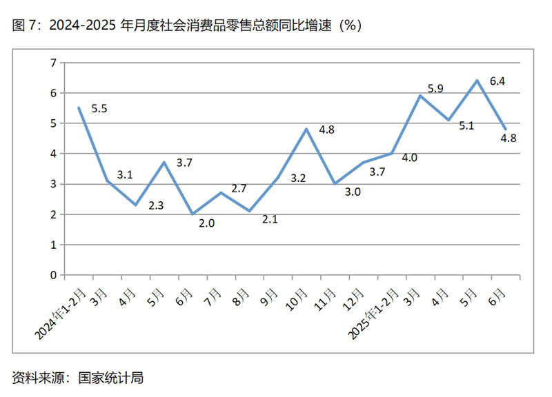 (二)社會消費(fèi)品零售總額增速比一季度回升,比上年同期也保持回升。上半年社會消費(fèi)品零售總額同比增長5.0%,比一季度增長4.6%回升了0.4個百分點(diǎn),比上年同期增長3.7%回升了1.3個百分點(diǎn)。其中, 餐飲收入同比增長4.3%,比一季度增長4.7%回落了0.4個百分點(diǎn);商品零售額增長5.1%,比一季度增長4.6%回升了0.5個百分點(diǎn)。需要關(guān)注的是,6月份社會消費(fèi)品零售總額增速出現(xiàn)了比較大的回落,對擴(kuò)大消費(fèi)又提出了新的挑戰(zhàn)。