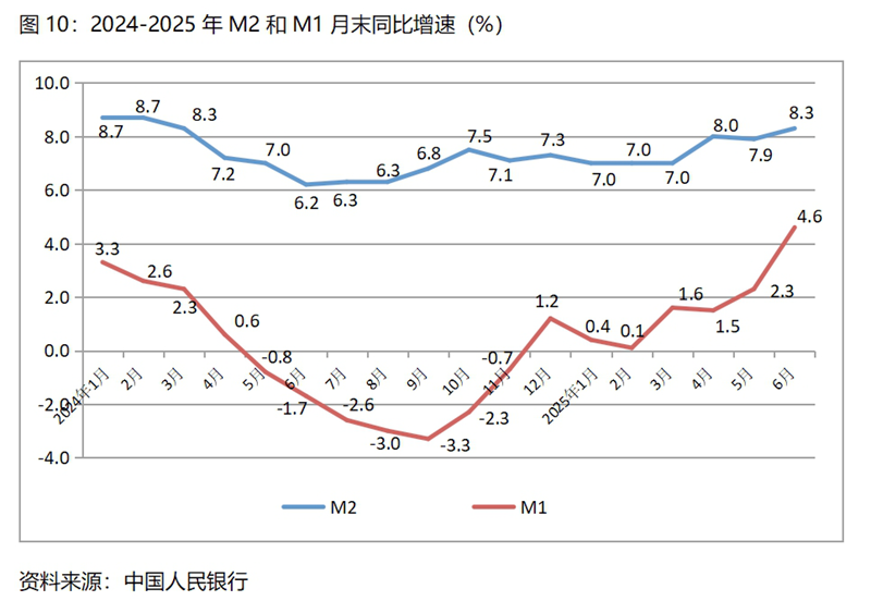 (五)廣義貨幣供應(yīng)量(M2)增速比一季度末和上年同期均保持回升,狹義貨幣供應(yīng)量(M1)增速比一季度末和上年同期也均保持回升。6月末,廣義貨幣供應(yīng)量同比增長8.3%,比一季度末增長7.0%回升了1.3個百分點(diǎn),比上年同期增長6.2%回升了2.1個百分點(diǎn),總體保持了今年以來持續(xù)回升的勢頭;6月末,狹義貨幣供應(yīng)量同比增長4.6%,比一季度末增長1.6%回升了3.0個百分點(diǎn),而上年同期為下降1.7%。說明今年以來的貨幣政策較好地堅(jiān)持了適度寬松的方向,為經(jīng)濟(jì)運(yùn)行提供了較為寬松的流動性,但從微觀經(jīng)營主體活力不足和價(jià)格低位運(yùn)行看,貨幣政策還有進(jìn)一步寬松的必要。