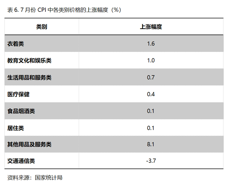 7月份,在CPI 8個(gè)類別中有7個(gè)類別保持上漲,1個(gè)類別下降。上漲的7個(gè)類別包括衣著類價(jià)格同比上漲1.6%,教育文化和娛樂類上漲1.0%,生活用品及服務(wù)類上漲0.7%,醫(yī)療保健類上漲0.4%,食品煙酒類上漲0.1%,居住類上漲0.1%,其他用品和服務(wù)類上漲8.1%;下降的雖然就交通通信類1個(gè)類別,但降幅仍還比較大,7月份同比下降3.7%。