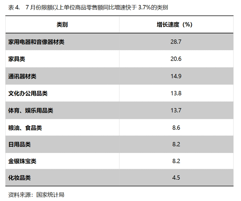 7月份,限額以上單位商品零售額同比增速快于社會(huì)消費(fèi)品零售總額3.7%增速的共有9類,即家用電器和音像器材類同比增長28.7%,家具類增長20.6%,通訊器材類增長14.9%,文化辦公用品類增長13.8%,體育、娛樂用品類增長13.7%,糧油、食品類增長8.6%,日用品類增長8.2%,金銀珠寶類增長8.2%,化妝品類增長4.5%。