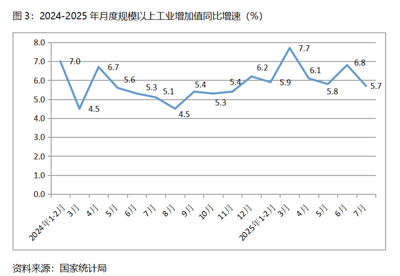 (一)工業(yè)增速由升轉(zhuǎn)落。7月份,規(guī)模以上工業(yè)增加值同比增長5.7%,比上月增長6.8%回落了1.1個(gè)百分點(diǎn),6月份比5月份回升了1.0個(gè)百分點(diǎn)。從工業(yè)三大門類看,采礦業(yè)和制造業(yè)增速比上月回落,電力、熱力、燃?xì)饧八a(chǎn)和供應(yīng)業(yè)增速回升,7月份采礦業(yè)同比增長5.0%,比上月回落1.1個(gè)百分點(diǎn);制造業(yè)增長6.2%,比上月回落1.2個(gè)百分點(diǎn);電力、熱力、燃?xì)饧八a(chǎn)和供應(yīng)業(yè)增長3.3%,比上月回升1.5個(gè)百分點(diǎn)。今年以來工業(yè)增速波動(dòng)的運(yùn)行,反映出工業(yè)的回升仍缺乏穩(wěn)固的基礎(chǔ)。
