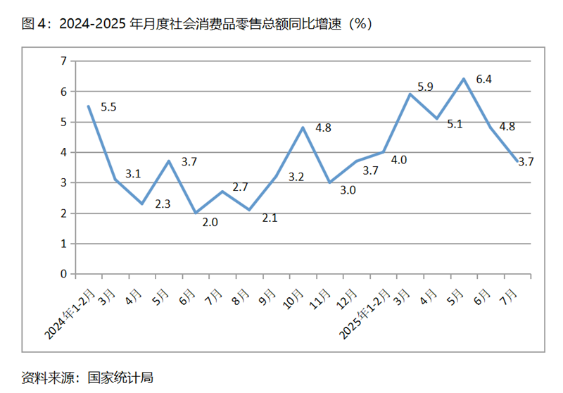 (二)零售增速持續(xù)回落。7月份,社會(huì)消費(fèi)品零售總額同比增長3.7%,比6月份增長4.8%回落了0.9個(gè)百分點(diǎn),6月份比5月份增長6.4%回落了1.6個(gè)百分點(diǎn),其中餐飲收入自6月份明顯回落后繼續(xù)保持低速增長,6月份餐飲收入同比增長0.9%,7月份增長1.1%。社會(huì)消費(fèi)品零售總額增速出現(xiàn)持續(xù)回落,除了餐飲收入持續(xù)低速增長的原因外,商品零售額增速的回落也是一個(gè)重要因素。這一變化趨勢(shì)對(duì)消費(fèi)需求的擴(kuò)大提出了新的挑戰(zhàn)。