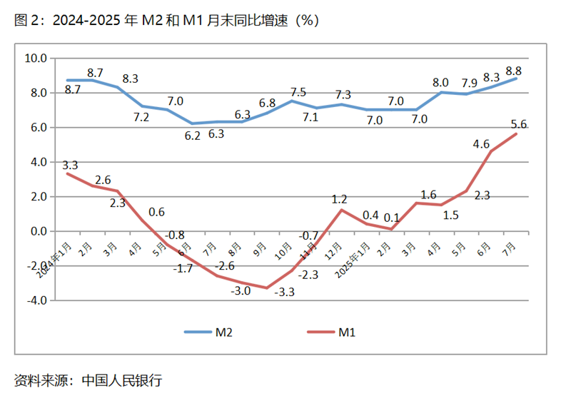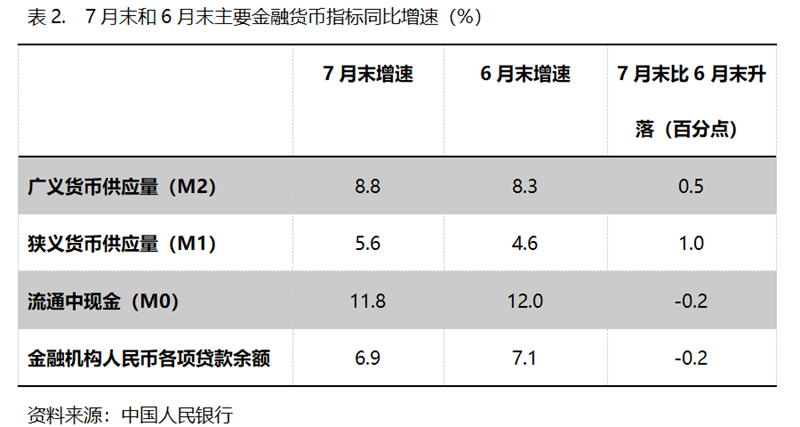 (二)M2增速持續(xù)回升。7月末,廣義貨幣供應(yīng)量(M2)同比增長8.8%,比6月末增長8.3%回升0.5個(gè)百分點(diǎn),6月末增速比5月末7.9%的增速回升了0.4個(gè)百分點(diǎn),保持了持續(xù)回升勢(shì)頭;狹義貨幣供應(yīng)量(M1)同比增長5.6%,比6月末增長4.6%回升1.0個(gè)百分點(diǎn),6月末增幅比5月末2.3%增幅回升2.3個(gè)百分點(diǎn);流通中貨幣(M0)增速持續(xù)小幅回落,7月末同比增長11.8%,比6月末增長12.0%回落0.2個(gè)百分點(diǎn),而6月末增速比5月末增速回落0.1個(gè)百分點(diǎn)。7月末M2和M1增速的持續(xù)回升,M0增速的基本持平,表明貨幣政策仍在向適度寬松方向的要求運(yùn)行, M1緩慢的增長仍需要給予高度關(guān)注。
