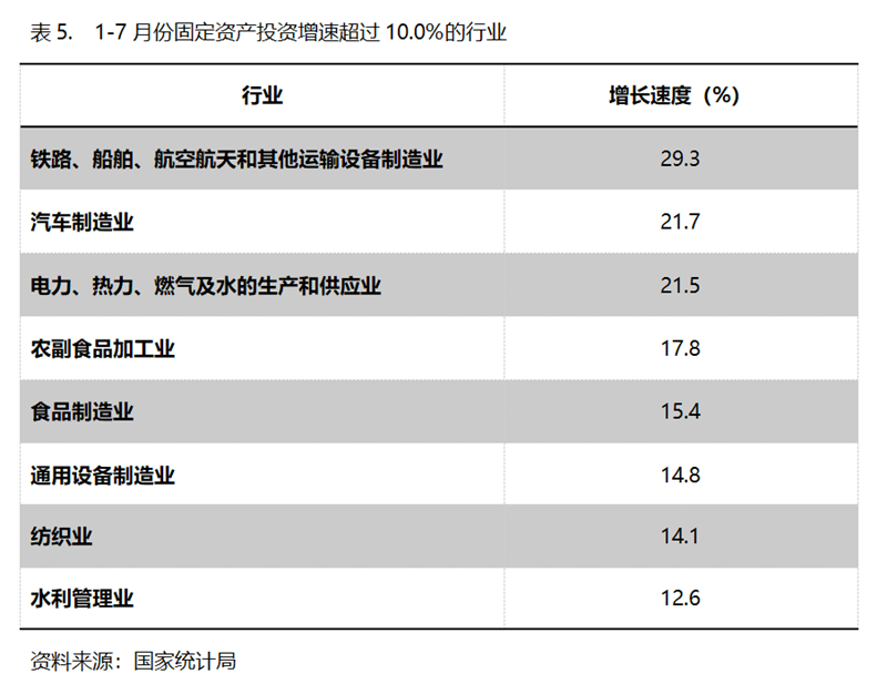 1-7月份,固定資產(chǎn)投資增速超過10.0%的主要行業(yè)共8個(gè),即鐵路、船舶、航空航天和其他運(yùn)輸設(shè)備制造業(yè)增長29.3%,汽車制造業(yè)增長21.7%,電力、熱力、燃?xì)饧八纳a(chǎn)和供應(yīng)業(yè)增長21.5%,農(nóng)副食品加工業(yè)增長17.8%,食品制造業(yè)增長15.4%,通用設(shè)備制造業(yè)增長14.8%,紡織業(yè)增長14.1%,水利管理業(yè)增長12.6%。