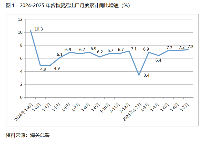 (一)貨物出口增速由平轉(zhuǎn)升。1-7月份,貨物出口同比增長7.3%,比1-6月份增長7.2%回升0.1個(gè)百分點(diǎn),1-6月份與1-5月份持平,增速呈現(xiàn)出由平轉(zhuǎn)升的態(tài)勢(shì)。貨物出口對(duì)主要貿(mào)易出口經(jīng)濟(jì)體增速有升有平也有落,1-7月份對(duì)歐盟出口同比增長8.2%,比1-6月份7.9%增速回升0.3個(gè)百分點(diǎn);對(duì)美國出口下降11.6%,比1-6月份下降9.9%擴(kuò)大1.7個(gè)百分點(diǎn);對(duì)東盟出口增長14.8%,比1-6月份14.3%增速回升0.5個(gè)百分點(diǎn);對(duì)拉丁美洲出口增長8.4%,與1-6月份8.4%增速持平;對(duì)非洲出口增長25.9%,比1-6月份23.0%增速回升2.9個(gè)百分點(diǎn)。面對(duì)較為復(fù)雜嚴(yán)峻的國際形勢(shì),出口增速由平轉(zhuǎn)升,充分說明我國出口有著較強(qiáng)的韌性。
