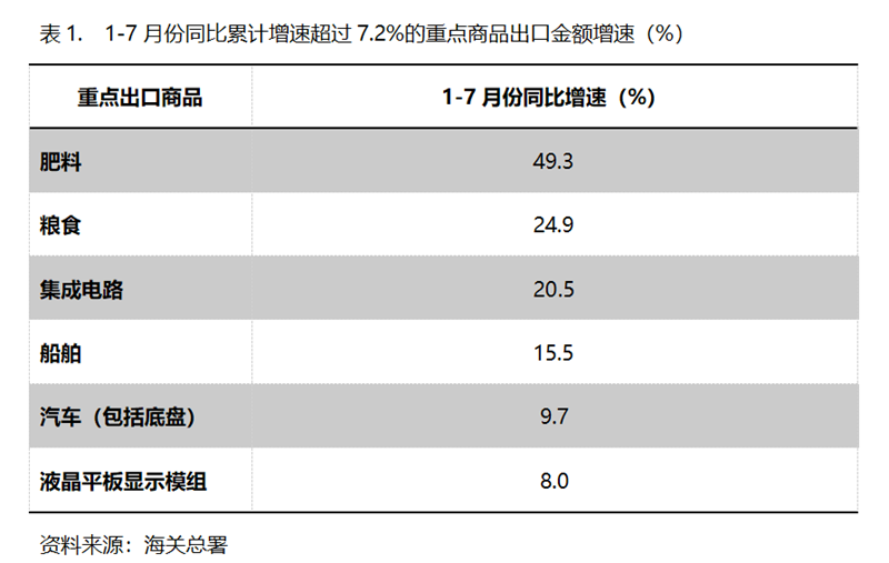 1-7月份,出口金額同比增速超過7.3%的重點(diǎn)商品共有6類,即肥料出口增長49.3%,糧食增長24.9%,集成電路增長20.5%,船舶增長15.5%,汽車(包括底盤)增長9.7%,液晶平板顯示模組增長8.0%。