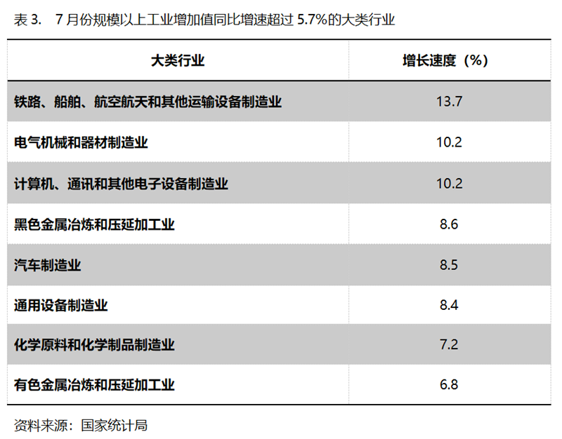 7月份,增長速度超過規(guī)模以上工業(yè)增長5.7%的主要大類行業(yè)共有8個(gè),即鐵路、船舶、航空航天和其他運(yùn)輸設(shè)備制造業(yè)同比增長13.7%,電氣機(jī)械和器材制造業(yè)增長10.2%,計(jì)算機(jī)、通訊和其他電子設(shè)備制造業(yè)增長10.2%,黑色金屬冶煉和壓延加工業(yè)增長8.6%,汽車制造業(yè)增長8.5%,通用設(shè)備制造業(yè)增長8.4%,化學(xué)原料和化學(xué)制品制造業(yè)增長7.2%,有色金屬冶煉和壓延加工業(yè)增長6.8%。