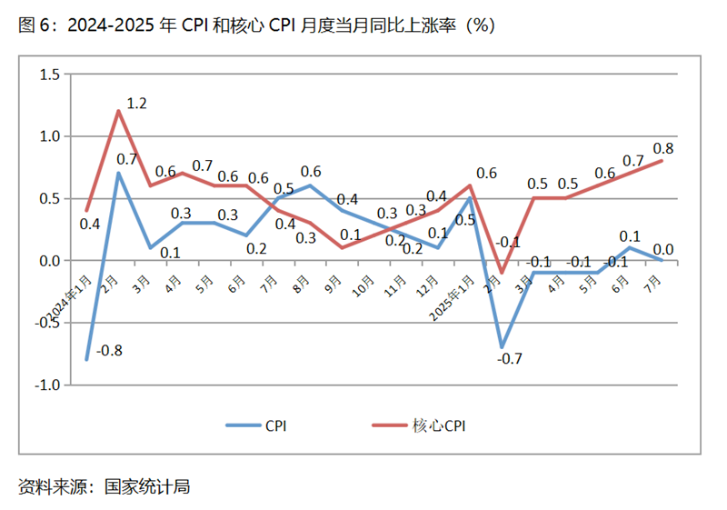 (四) CPI漲幅比上月回落。7月份,CPI同比漲幅持平,比6月份上漲0.1%回落0.1個(gè)百分點(diǎn), 自3月份以來一直保持在-0.1-0.1%區(qū)間,持續(xù)呈現(xiàn)低位運(yùn)行態(tài)勢(shì)。7月份,核心CPI同比上漲0.8%,比6月份上漲0.7%上升了0.1個(gè)百分點(diǎn)。雖然核心CPI漲幅保持回升的態(tài)勢(shì),經(jīng)濟(jì)運(yùn)行活力有所增強(qiáng),但漲幅也十分有限,加之CPI一直處于較低水平,經(jīng)濟(jì)運(yùn)行活力仍較為偏弱,宏觀政策更加積極和寬松仍十分必要。