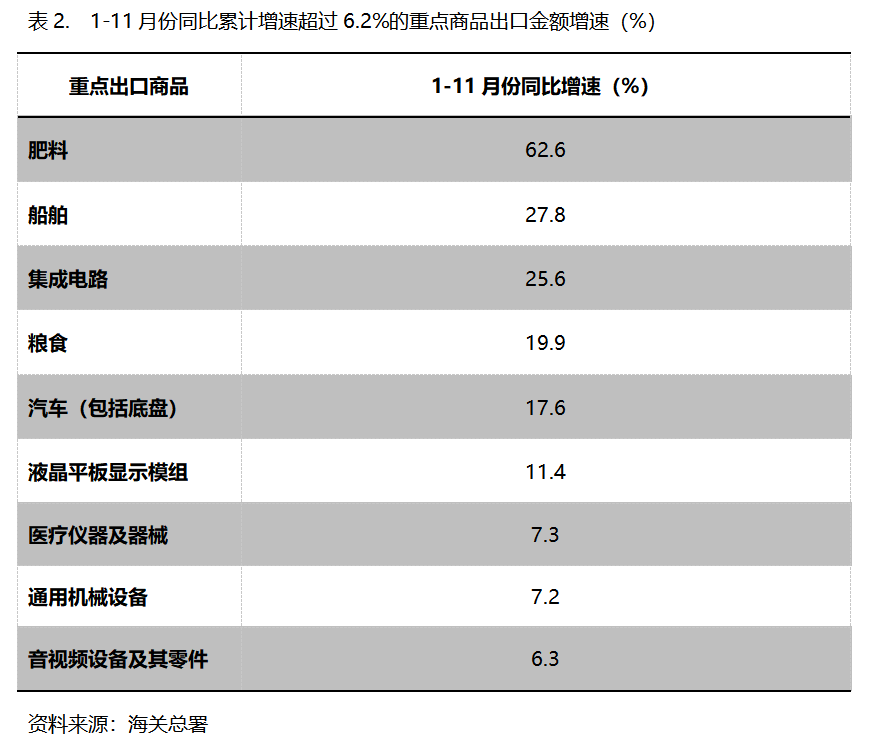 1-11月份,出口金額同比增速超過(guò)6.2%的重點(diǎn)商品共有9類(lèi),即肥料出口增長(zhǎng)62.6%,船舶增長(zhǎng)27.8%,集成電路增長(zhǎng)25.6%,糧食增長(zhǎng)19.9%,汽車(chē)(包括底盤(pán))增長(zhǎng)17.6%,液晶平板顯示模組增長(zhǎng)11.4%,醫(yī)療儀器及器械增長(zhǎng)7.3%,通用機(jī)器設(shè)備增長(zhǎng)7.2%,音視頻設(shè)備及其零件增長(zhǎng)6.3%。
