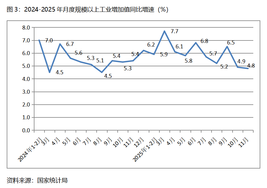 三、工業(yè)增速持續(xù)回落。11月份,規(guī)模以上工業(yè)增加值同比增長(zhǎng)4.8%,比10月份增長(zhǎng)4.9%回落了0.1個(gè)百分點(diǎn),10月份比9月份增長(zhǎng)6.5%回落了1.6個(gè)百分點(diǎn)。從工業(yè)三大門(mén)類(lèi)看,采礦業(yè)增速比上月回升,制造業(yè)和電力、熱力、燃?xì)饧八a(chǎn)和供應(yīng)業(yè)增速回落,11月份,采礦業(yè)同比增長(zhǎng)6.3%,比上月增長(zhǎng)4.5%回升1.8個(gè)百分點(diǎn);制造業(yè)增長(zhǎng)4.6%,比上月增長(zhǎng)4.9%回落0.3個(gè)百分點(diǎn);電力、熱力、燃?xì)饧八a(chǎn)和供應(yīng)業(yè)增長(zhǎng)4.3%,比上月增長(zhǎng)5.4回落1.1個(gè)百分點(diǎn)。