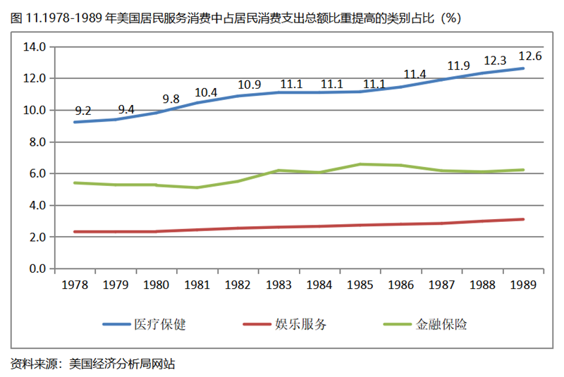 由于數(shù)據(jù)來(lái)源的原因,重點(diǎn)將看一下美國(guó)居民服務(wù)消費(fèi)類(lèi)別在人均GDP超過(guò)1萬(wàn)美元后的變化情況。美國(guó)居民服務(wù)消費(fèi)共有7個(gè)大類(lèi)別,在1978-1989年期間占居民消費(fèi)支出總額比重提高的有3個(gè)類(lèi)別,分別是醫(yī)療保健、娛樂(lè)服務(wù)和金融保險(xiǎn),醫(yī)療保健占居民消費(fèi)支出總額的比重提高了3.4個(gè)百分點(diǎn),娛樂(lè)服務(wù)和金融保險(xiǎn)占居民消費(fèi)支出總額的比重均提高了0.8個(gè)百分點(diǎn)。