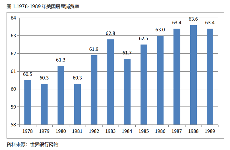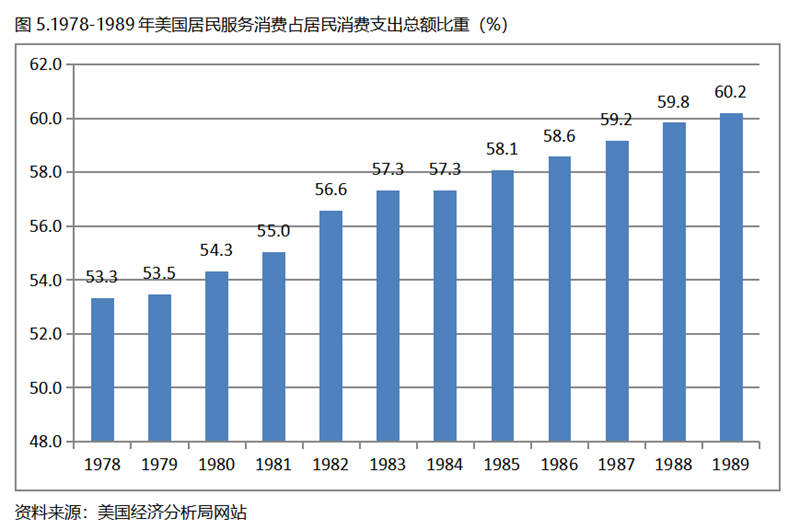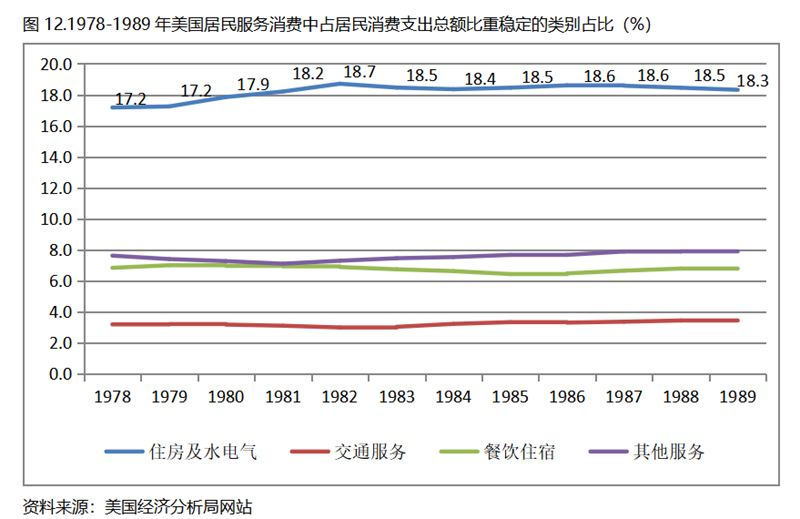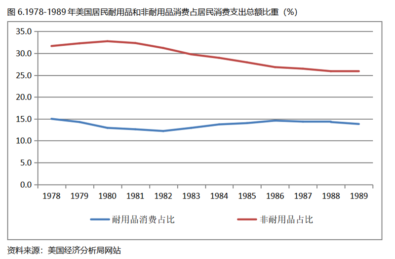 美國(guó)在人均GDP超過(guò)1萬(wàn)美元后的1978-1989年期間,居民服務(wù)消費(fèi)占居民消費(fèi)支出總額持續(xù)提高,而居民耐用品消費(fèi)占居民消費(fèi)支出總額比重、非耐用品消費(fèi)占居民消費(fèi)支出總額比重均呈現(xiàn)下降趨勢(shì)。