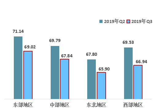 2.從四大區(qū)域來看,東部和中部地區(qū)繼續(xù)保持第一、第二,東北地區(qū)從上季度開始落后西部地區(qū)的情況沒有發(fā)生改變,而且差距呈擴大趨勢;